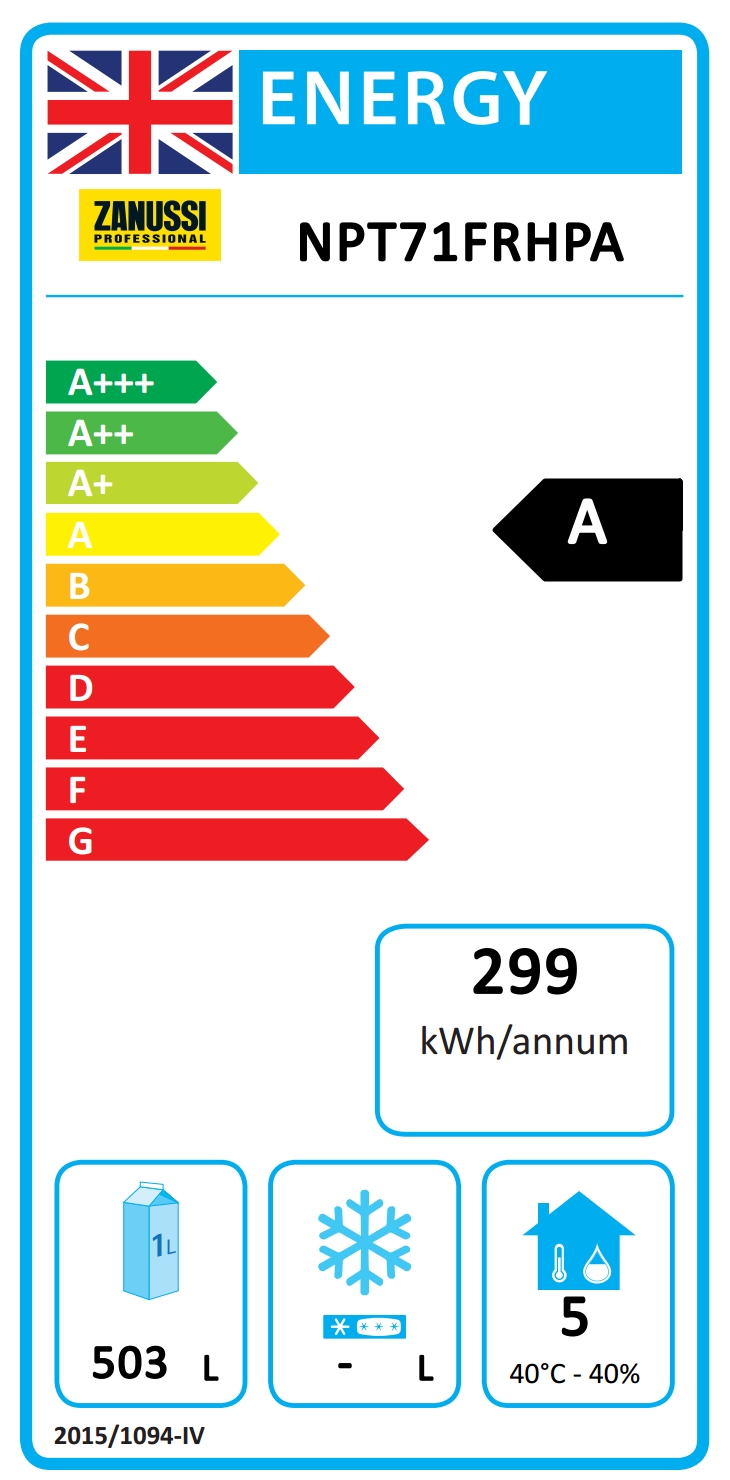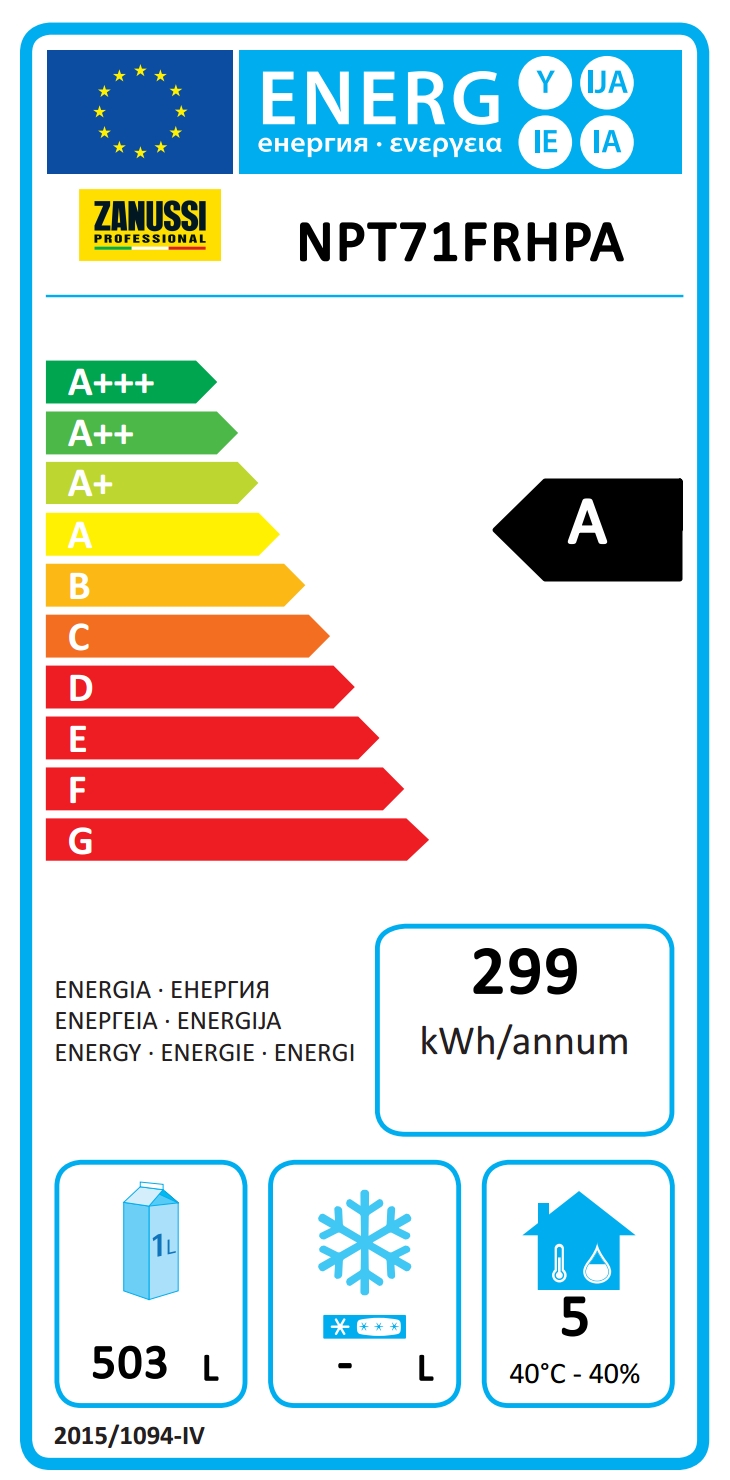 • Armadio certificato di classe A in condizioni di lavoro pesante (40°C - 40% di umidità) secondo le direttive Europee di Ecodesign. Il risparmio energetico fino a 300 €/anno si ottiene confrontando i frigoriferi e freezer della classe G con quelli equivalenti della classe A (costo energetico di 0,21 €/kWh e volume netto di 503 lt).